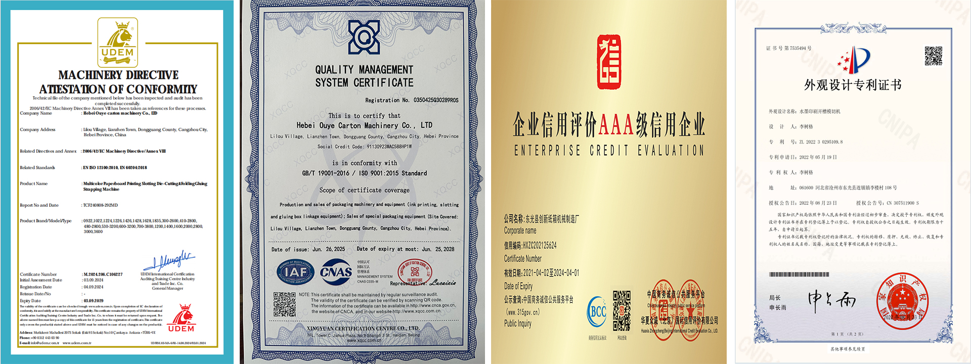 Our factory holds a comprehensive range of authoritative certifications and intellectual property rights, including ISO 9001 Quality Management System Certification, CE Certification, China Enterprise Credit Evaluation Certificate, and multiple national patents. These qualifications fully demonstrate our strict compliance with international standards, reliable quality management system, strong technical innovation capability, and excellent business reputation. We always adhere to standardized management and strict quality control in every link of production, operation and service, ensuring that our carton machinery meets global safety and quality requirements. With authoritative qualifications and independent intellectual property rights as our guarantee, we continuously improve product performance, technical level and service quality, and are committed to providing customers with high-quality, safe, reliable and innovative packaging machinery solutions. Our certifications and patents not only reflect our professional strength and technical advantages, but also represent our firm commitment to product quality, technological innovation and customer trust. Relying on complete qualifications, standardized management and independent R&D capabilities, we have established long-term and stable cooperative relations with customers from all over the world, and have won wide recognition and praise in the international market.